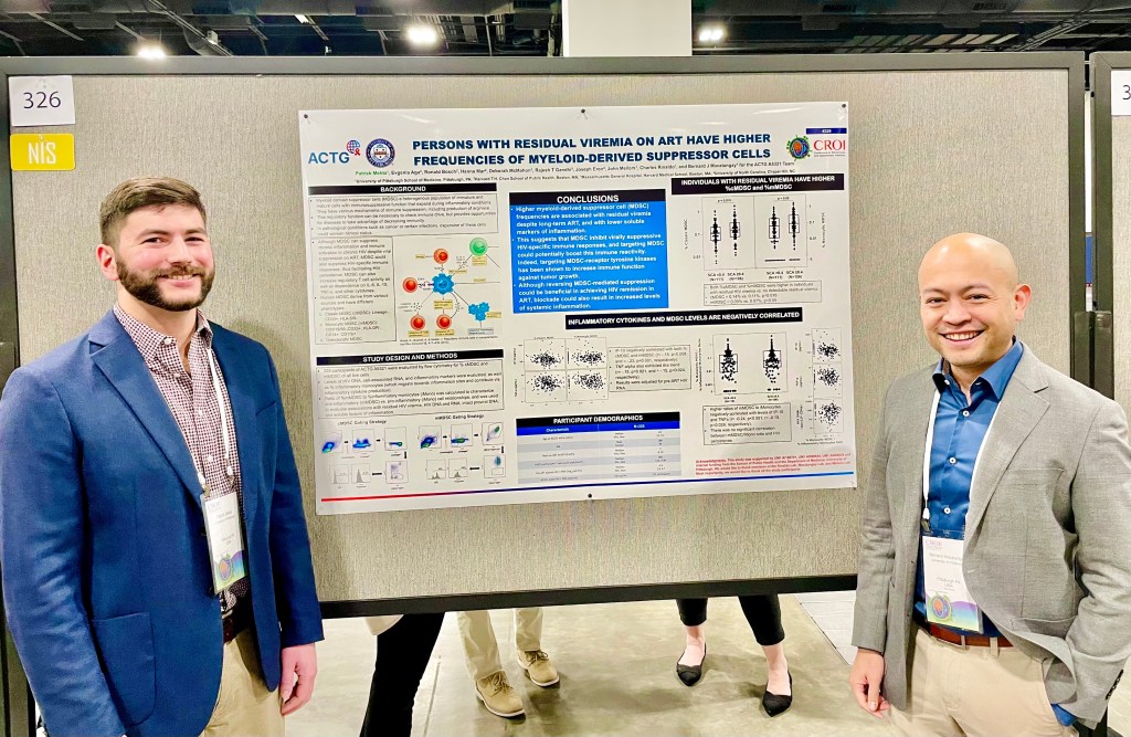 Patrick Mehta takes the lead on “Persons With Residual Viremia on ART Have Higher Frequencies of Myeloid-Derived Suppressor Cells.” He’s currently presenting in Denver alongside study mentor and coauthor, Dr. Bernard Macatangay, MD.