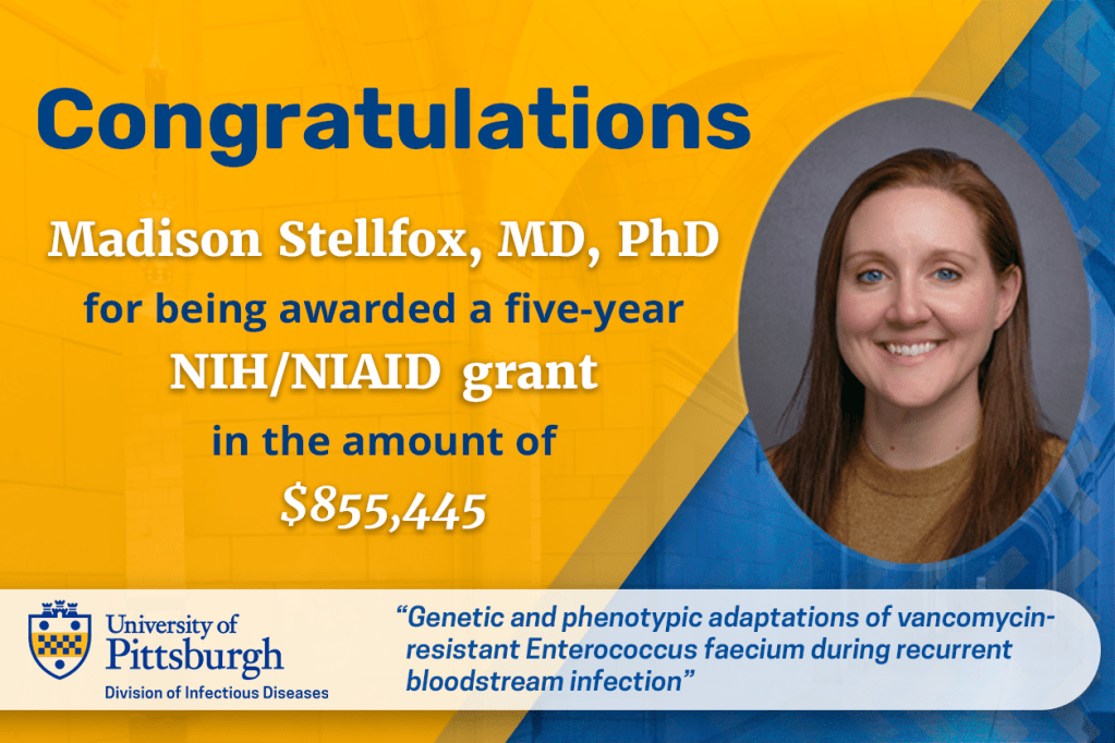 We are pleased to announce that Madison E. Stellfox, MD, PhD, has been awarded funding in the amount of $855,445 for a five-year grant by the National Institutes of Health/National Institute of Allergy and Infectious Diseases (NIH/NIAID) entitled, “Genetic and phenotypic adaptations of vancomycin- resistant Enterococcus faecium during recurrent bloodstream infection.” This proposal was submitted in response to the competitive funding opportunity entitled, “Mentored Clinical Scientist Research Career Development Award (Parent K08 Independent Clinical Trial Not Allowed)” under funding opportunity number PA-20-203.