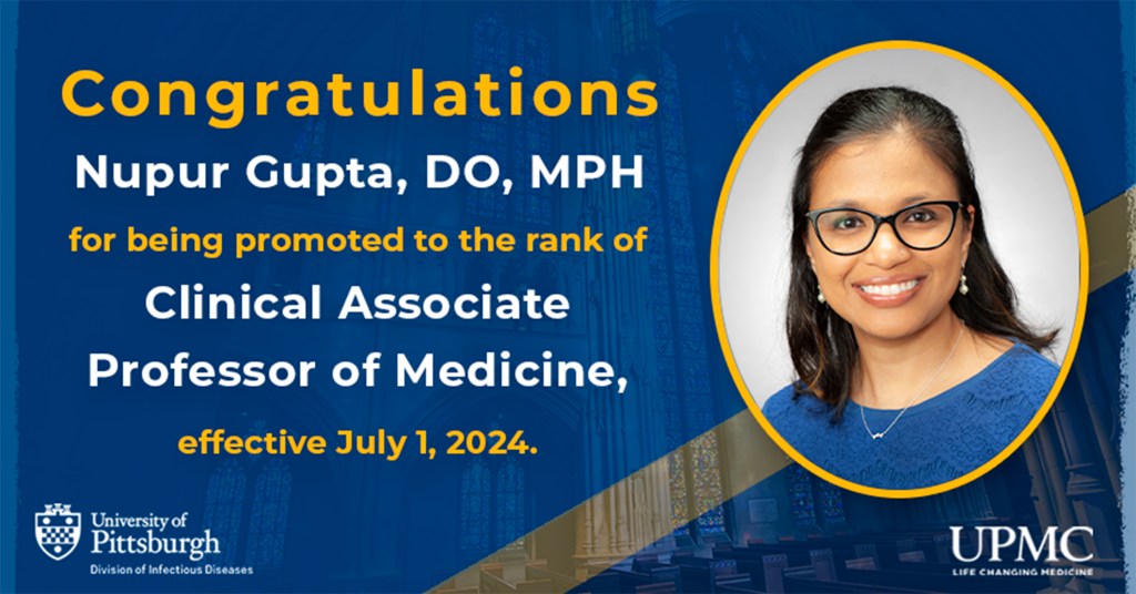We are pleased to announce that Nupur Gupta, DO, MPH, was recently promoted to the rank of Clinical Associate Professor of Medicine retroactive to July 1, 2024. Dr. Gupta joined the ID Division as an ID Fellow in 2017. During her fellowship, she served as the medical education fellow and completed a sub-specialization in HIV/AIDS. Dr. Gupta joined the faculty of the Division of Infectious Diseases at the rank of Clinical Assistant Professor of Medicine in 2019.